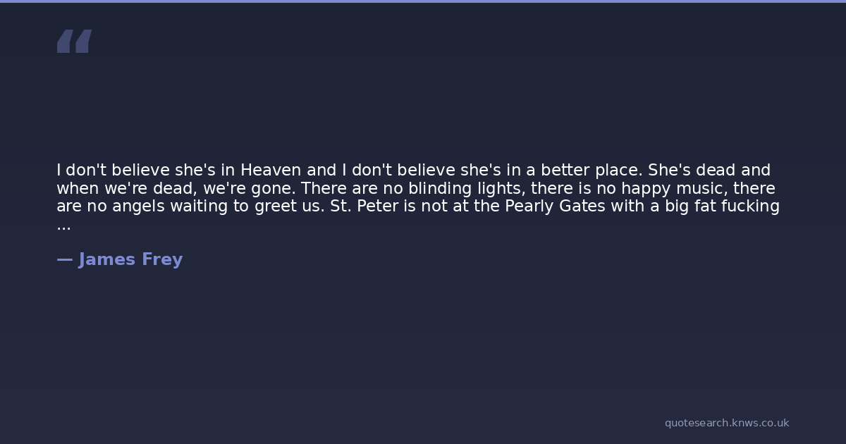 I don't believe she's in Heaven and I don't believe she's in a better place. She's dead and when we're dead, we're gone. There are no blinding lights, there is no happy music, there are no angels waiting to greet us. St. Peter is not at the Pearly Gates with a big fat fucking book, our friends and Relatives are not holding a seat for us at a divine dinner table, we do not get a tour of Heaven. We're dead and that is it. No more.