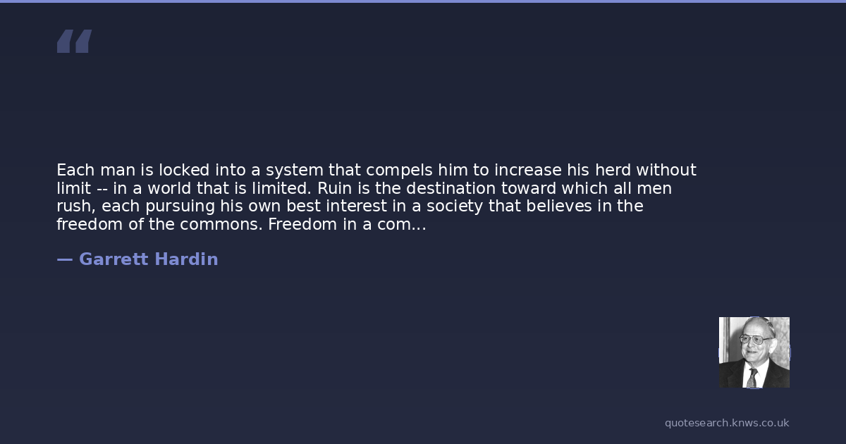 Each man is locked into a system that compels him to increase his herd without limit -- in a world that is limited. Ruin is the destination toward which all men rush, each pursuing his own best interest in a society that believes in the freedom of the commons. Freedom in a commons brings ruin to all.