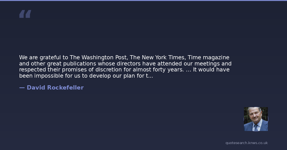 We are grateful to The Washington Post, The New York Times, Time magazine and other great publications whose directors have attended our meetings and respected their promises of discretion for almost forty years. … It would have been impossible for us to develop our plan for the world if we had been subject to the bright lights of publicity during those years. But, the world is now much more sophisticated and prepared to march towards a world government. The supranational sovereignty of an intellectual elite and world bankers is surely preferable to the national auto-determination practiced in past centuries.