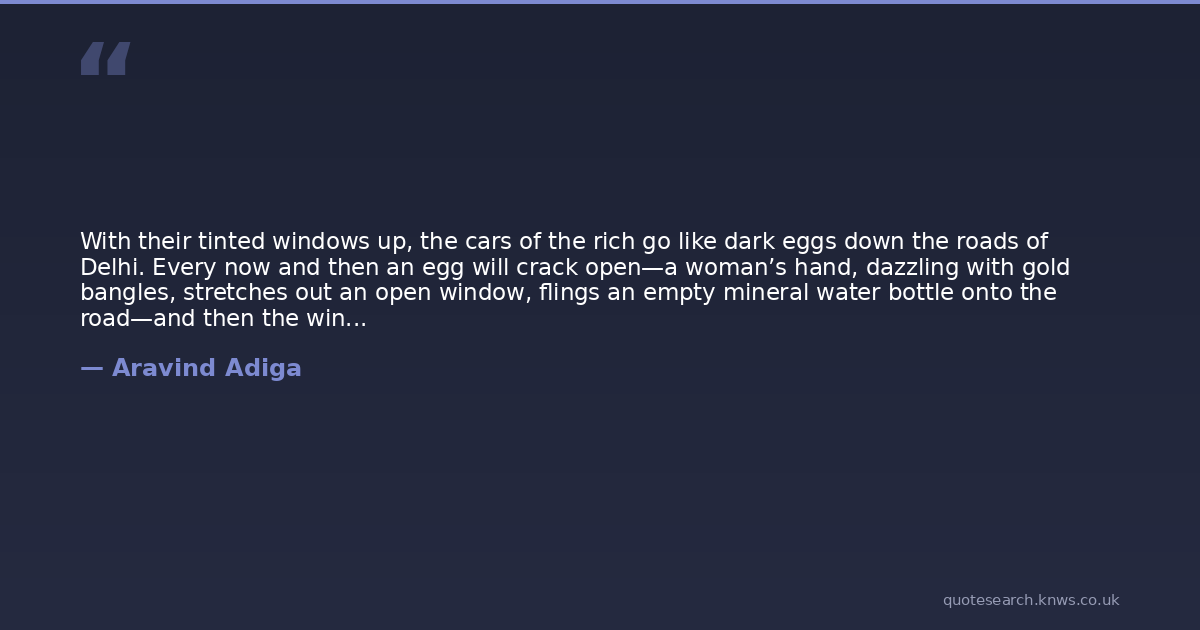 With their tinted windows up, the cars of the rich go like dark eggs down the roads of Delhi. Every now and then an egg will crack open—a woman’s hand, dazzling with gold bangles, stretches out an open window, flings an empty mineral water bottle onto the road—and then the window goes up, and the egg is resealed.