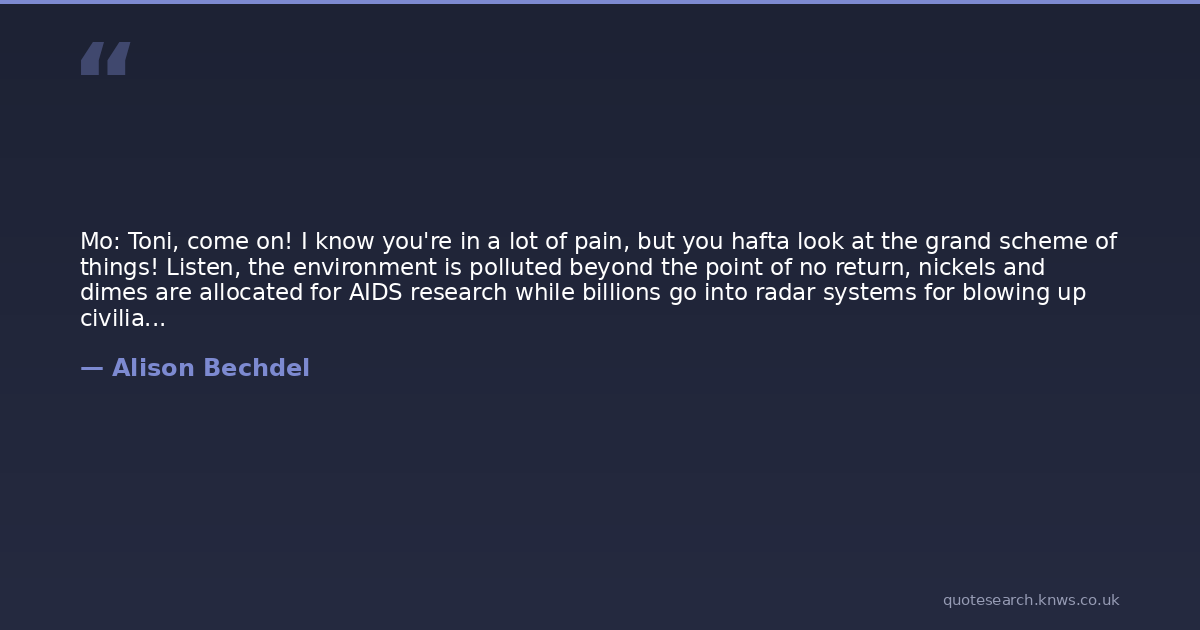Mo: Toni, come on! I know you're in a lot of pain, but you hafta look at the grand scheme of things! Listen, the environment is polluted beyond the point of no return, nickels and dimes are allocated for AIDS research while billions go into radar systems for blowing up civilians in the Persian Gulf, and we've got to spend the next two months being assaulted with hypocritical hype as two morally bankrupt white boys gear up for another electoral farce! Having a rough time in your relationship kinda pales in comparison, huh?Toni: Gee, Mo... thanks. I can always count on you.