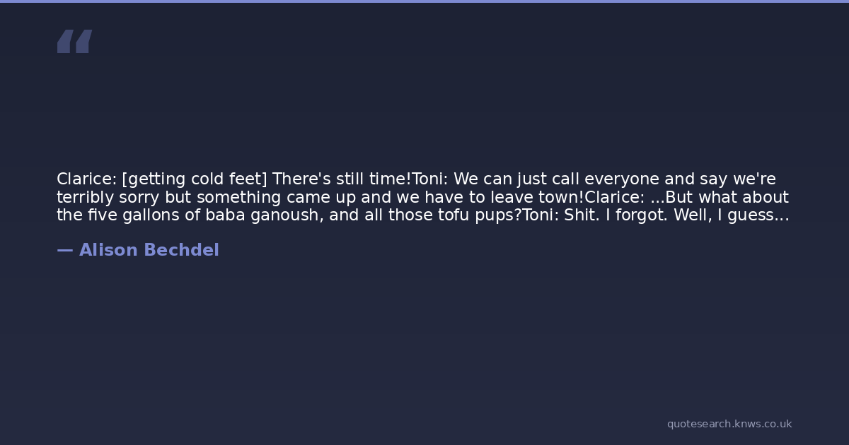 Clarice: [getting cold feet] There's still time!Toni: We can just call everyone and say we're terribly sorry but something came up and we have to leave town!Clarice: ...But what about the five gallons of baba ganoush, and all those tofu pups?Toni: Shit. I forgot. Well, I guess we'll just have to go through with it, then.