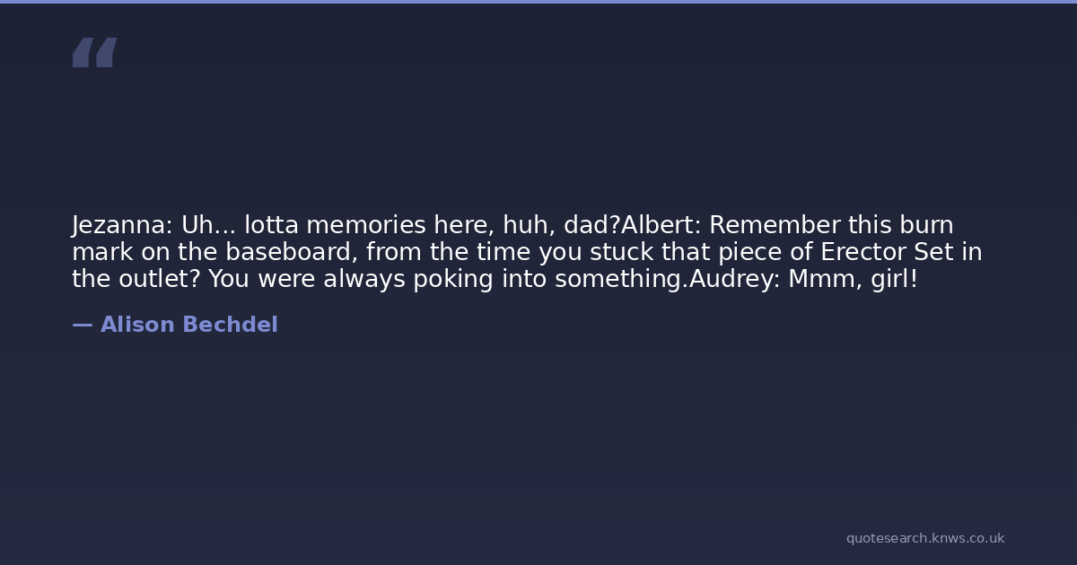 Jezanna: Uh... lotta memories here, huh, dad?Albert: Remember this burn mark on the baseboard, from the time you stuck that piece of Erector Set in the outlet? You were always poking into something.Audrey: Mmm, girl!