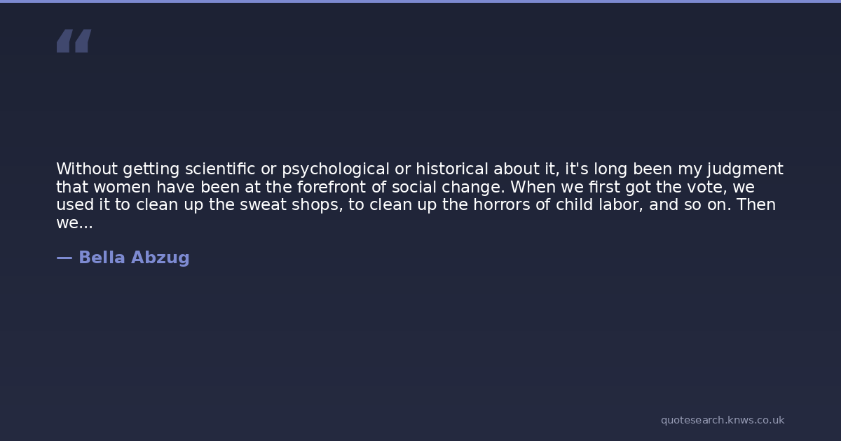 Without getting scientific or psychological or historical about it, it's long been my judgment that women have been at the forefront of social change. When we first got the vote, we used it to clean up the sweat shops, to clean up the horrors of child labor, and so on. Then we got sidetracked. Instead of carrying forth Carrie Chapman Catt's notion that women should organize as a political movement, the movement became nonpartisan and followed the League of Women Voters route. So between their nonpositions and Madison Avenue's assigned stereotype of women as flowers in the home who can be sold all kinds of products to beautify themselves, and Hollywood with its awful stereotypes, women were sunk. Up until now, we've been laboring under the concept of women as appendages to men and children and subjected to constant brainwashing by Madison Avenue, Hollywood, TV-and the descendants of John Adams who know when they have a good thing going. We now see the concept changing because the women's movement, which renewed itself several years ago as an intellectual revolt of the bored middle class housewife, has grown into a broad movement seeking complete economic, social and political change in all arenas. It's like the black movement, which started out over the right to a seat in the front of the bus and then extended itself to pursue for the black people their rightful piece of the whole system. The women's movement, like the black movement and the movement of the young people, comes at a time when the system is not responding to the largest numbers of its people. This puts all these movements in a very critical perspective, because out of all this ferment the last thing we can realistically expect is for things to remain the same. (p 202)