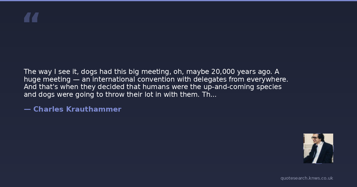 The way I see it, dogs had this big meeting, oh, maybe 20,000 years ago. A huge meeting — an international convention with delegates from everywhere. And that's when they decided that humans were the up-and-coming species and dogs were going to throw their lot in with them. The decision was obviously not unanimous. The wolves and dingoes walked out in protest.