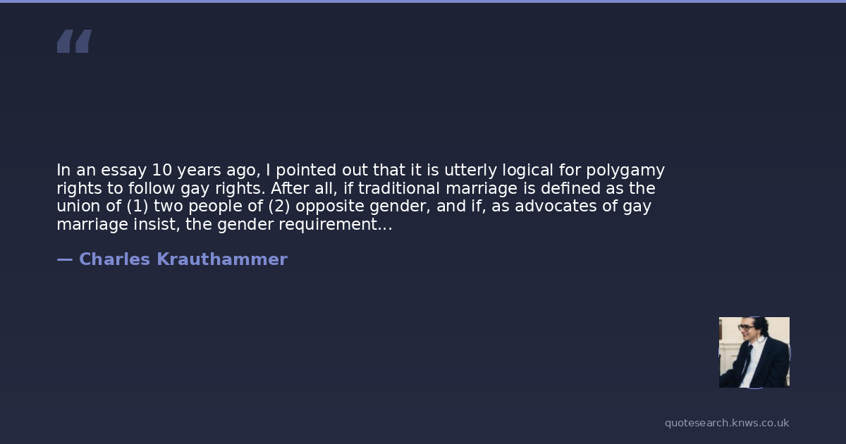 In an essay 10 years ago, I pointed out that it is utterly logical for polygamy rights to follow gay rights. After all, if traditional marriage is defined as the union of (1) two people of (2) opposite gender, and if, as advocates of gay marriage insist, the gender requirement is nothing but prejudice, exclusion and an arbitrary denial of one's autonomous choices in love, then the first requirement — the number restriction (two and only two) — is a similarly arbitrary, discriminatory and indefensible denial of individual choice.