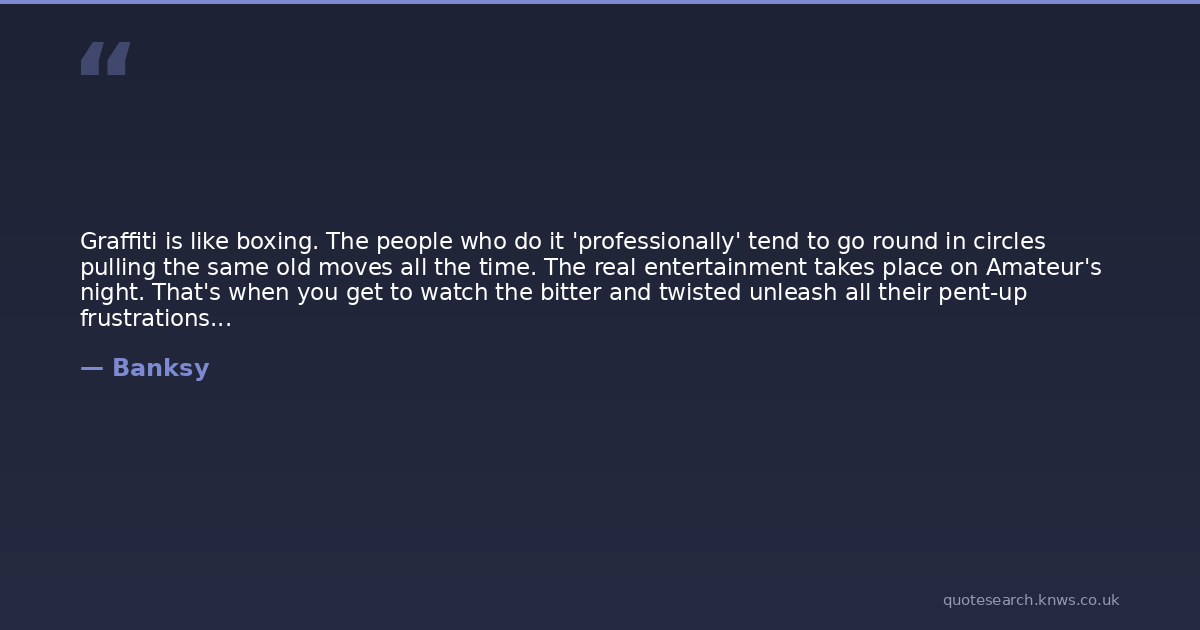 Graffiti is like boxing. The people who do it 'professionally' tend to go round in circles pulling the same old moves all the time. The real entertainment takes place on Amateur's night. That's when you get to watch the bitter and twisted unleash all their pent-up frustrations on an unsuspecting public in a desperate attempt to make some kind of point before collapsing under a cloud of their own blooded spit.