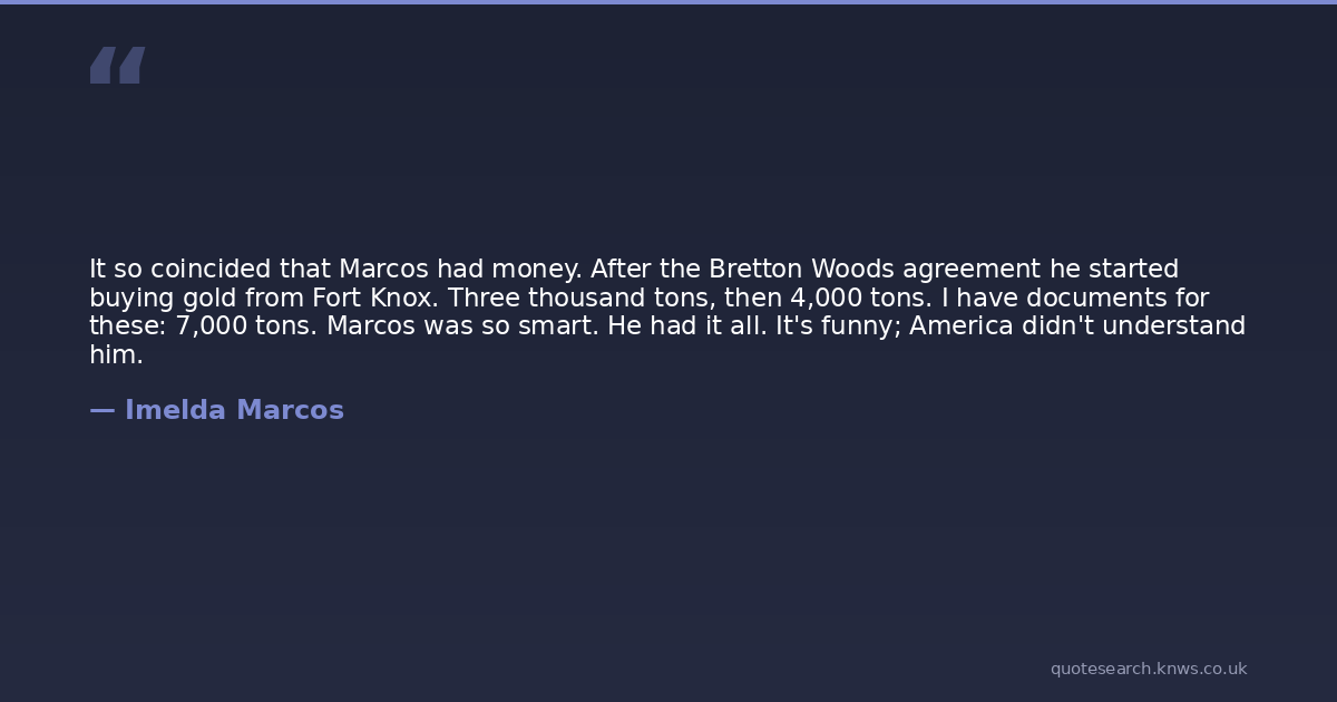 It so coincided that Marcos had money. After the Bretton Woods agreement he started buying gold from Fort Knox. Three thousand tons, then 4,000 tons. I have documents for these: 7,000 tons. Marcos was so smart. He had it all. It's funny; America didn't understand him.