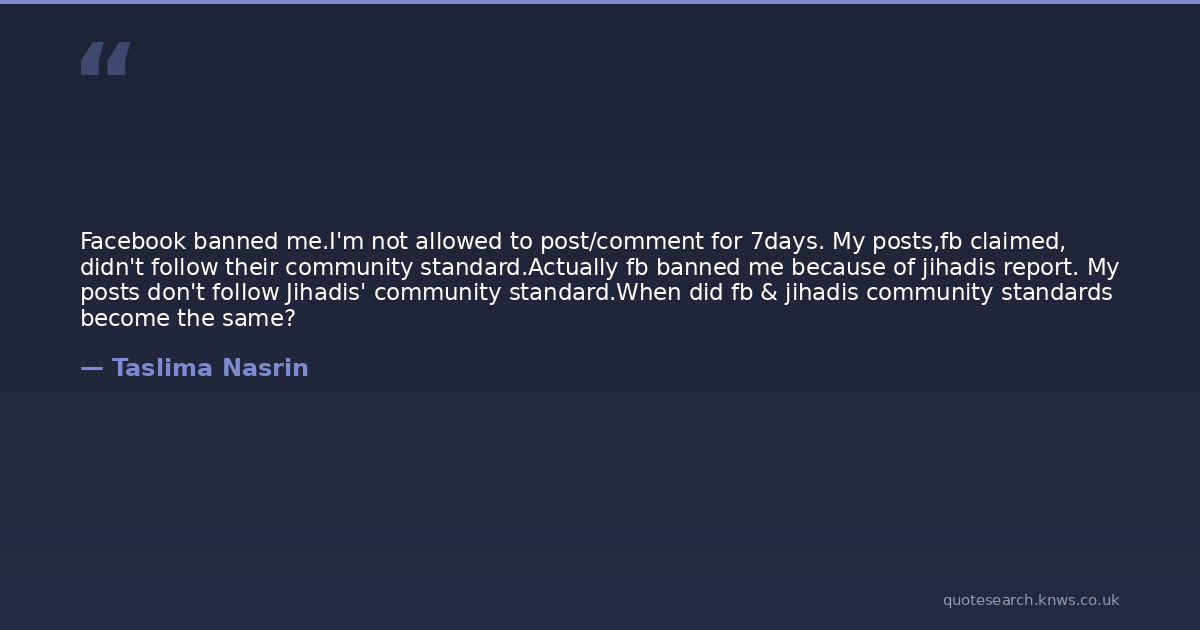 Facebook banned me.I'm not allowed to post/comment for 7days. My posts,fb claimed, didn't follow their community standard.Actually fb banned me because of jihadis report. My posts don't follow Jihadis' community standard.When did fb & jihadis community standards become the same?