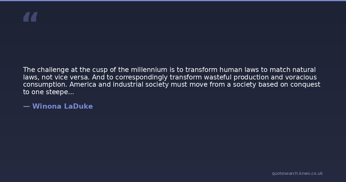 The challenge at the cusp of the millennium is to transform human laws to match natural laws, not vice versa. And to correspondingly transform wasteful production and voracious consumption. America and industrial society must move from a society based on conquest to one steeped in the practice of survival. In order to do that, we must close the circle. The linear nature of industrial production itself, in which labor and technology turn natural wealth into consumer products and wastes, must be transformed into a cyclical system.