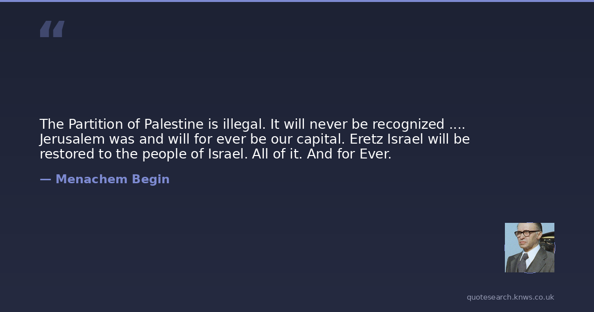 The Partition of Palestine is illegal. It will never be recognized .... Jerusalem was and will for ever be our capital. Eretz Israel will be restored to the people of Israel. All of it. And for Ever.