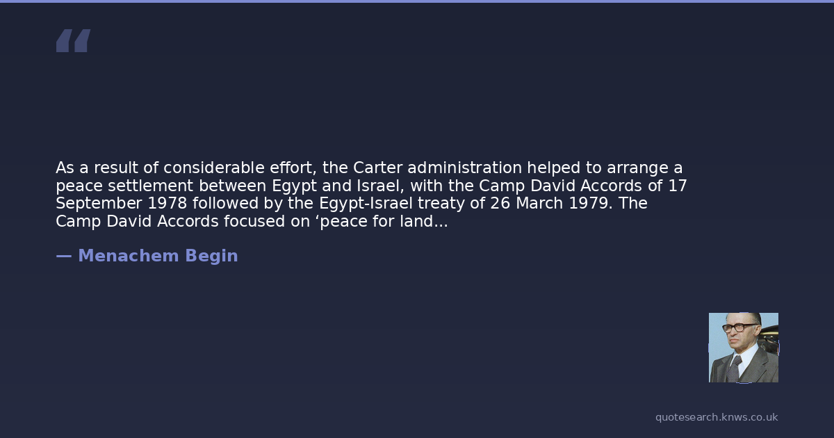 As a result of considerable effort, the Carter administration helped to arrange a peace settlement between Egypt and Israel, with the Camp David Accords of 17 September 1978 followed by the Egypt-Israel treaty of 26 March 1979. The Camp David Accords focused on ‘peace for land’, Israel withdrawing from its Sinai (although not Gaza) gains of 1967, and Egypt, in return, signing a formal peace treaty with Israel, and thereby giving recognition. Nasser’s successor, Anwar Sadat, the Egyptian President, who had expelled Soviet advisers in 1972, wanted to include the Palestinians in the treaty, but Menachem Begin, the Israeli Prime Minister, was willing only to agree to an informal link to a temporary halt on new Israeli settlements on the West Bank. The peace process was condemned by the Soviet Union and the PLO (Palestine Liberation Organisation). Nevertheless, the peace agreement helped lessen tensions in the Middle East (not least by isolating Syria and the PLO), which was important as, from 1979, the Cold War was to become far more difficult in South Asia.