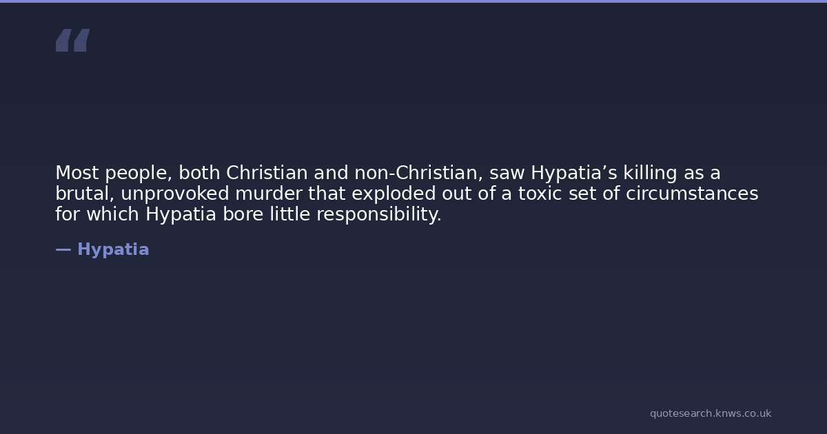 Most people, both Christian and non-Christian, saw Hypatia’s killing as a brutal, unprovoked murder that exploded out of a toxic set of circumstances for which Hypatia bore little responsibility.