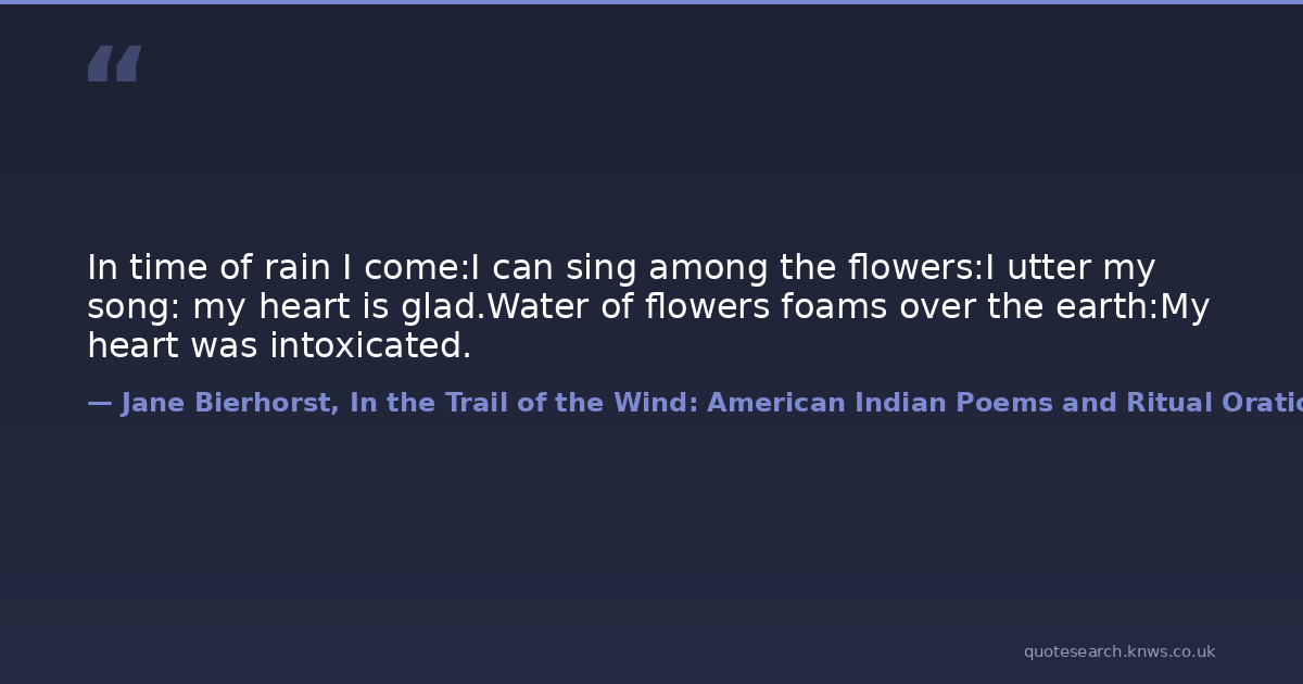 In time of rain I come:I can sing among the flowers:I utter my song: my heart is glad.Water of flowers foams over the earth:My heart was intoxicated.