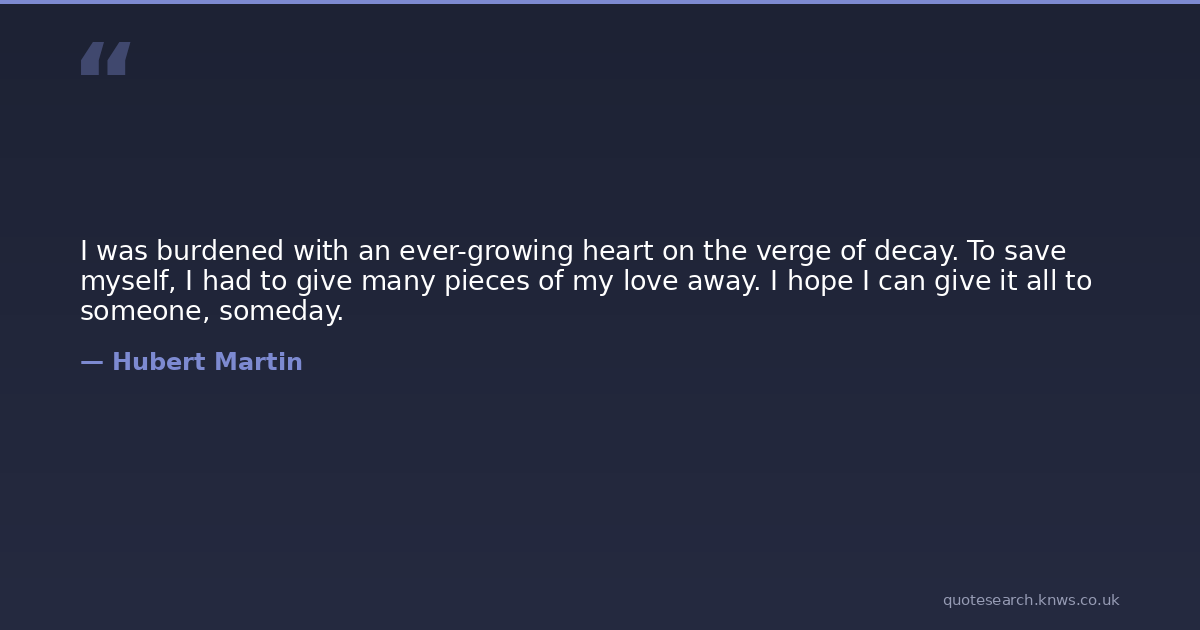 I was burdened with an ever-growing heart on the verge of decay. To save myself, I had to give many pieces of my love away. I hope I can give it all to someone, someday.