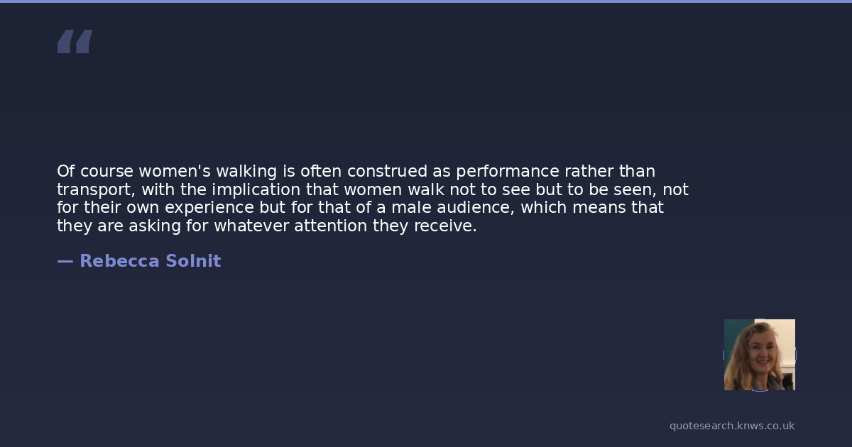 Of course women's walking is often construed as performance rather than transport, with the implication that women walk not to see but to be seen, not for their own experience but for that of a male audience, which means that they are asking for whatever attention they receive.
