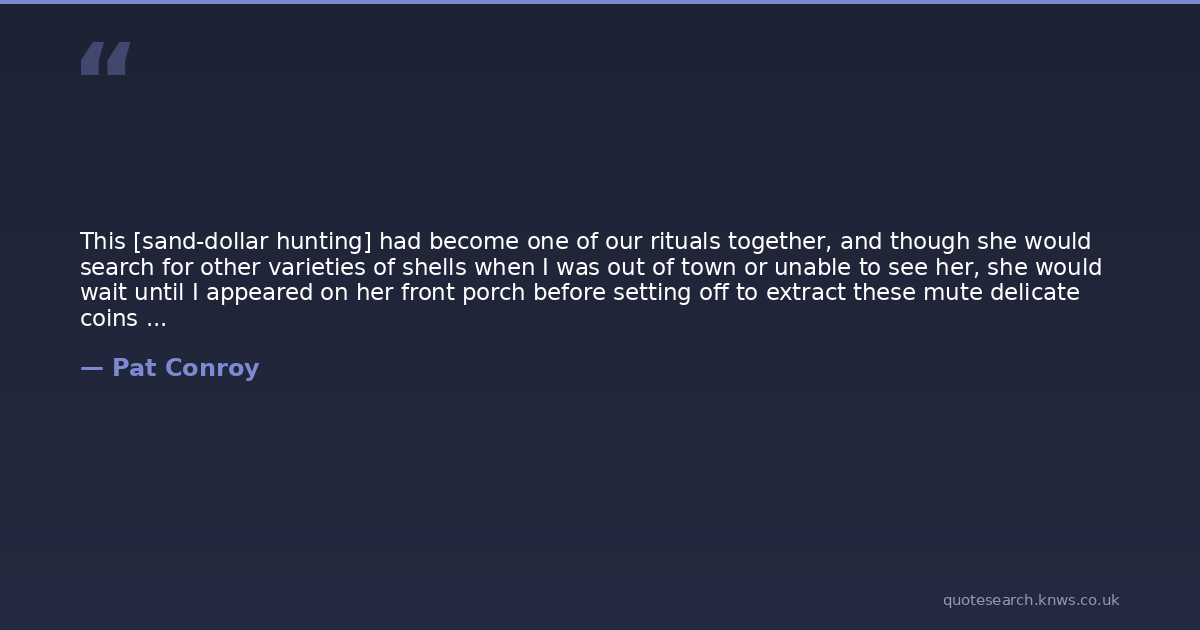 This [sand-dollar hunting] had become one of our rituals together, and though she would search for other varieties of shells when I was out of town or unable to see her, she would wait until I appeared on her front porch before setting off to extract these mute delicate coins from their settings in the sand. At first, we had collected only the larger specimens, but gradually as we learned what was rare and to be truly prized, we began to gather only the smallest sand dollars for our collection. Our trophies were sometimes as small as thumbnails and as fragile as contact lenses. Annie Kate collected the tiniest relics, round and cruciform and white as bone china when dried of sea water, and placed them in a glass-and-copper cricket box in her bedroom. Often we would sit together and admire the modest splendor of our accumulation. At times it looked like the coinage of a shy, diminutive species of angel. Our quest to find the smallest sand dollar became a competition between us, and as the months passed and Annie Kate grew larger with the child, the brittle, desiccated animals we unearthed from the sand became smaller and smaller. It was all a matter of training the eye to expect less.