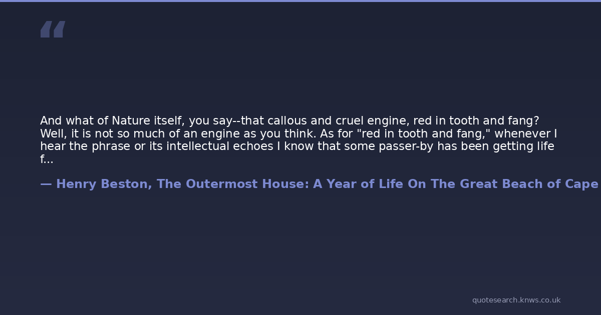 And what of Nature itself, you say--that callous and cruel engine, red in tooth and fang? Well, it is not so much of an engine as you think. As for "red in tooth and fang," whenever I hear the phrase or its intellectual echoes I know that some passer-by has been getting life from books. It is true that there are grim arrangements. Beware of judging them by whatever human values are in style. As well expect Nature to answer to your human values as to come into your house and sit in a chair. The economy of nature, its checks and balances, its measurements of competing life--all this is its great marvel and has an ethic of its own. Live in Nature, and you will soon see that for all its non-human rhythm, it is no cave of pain.