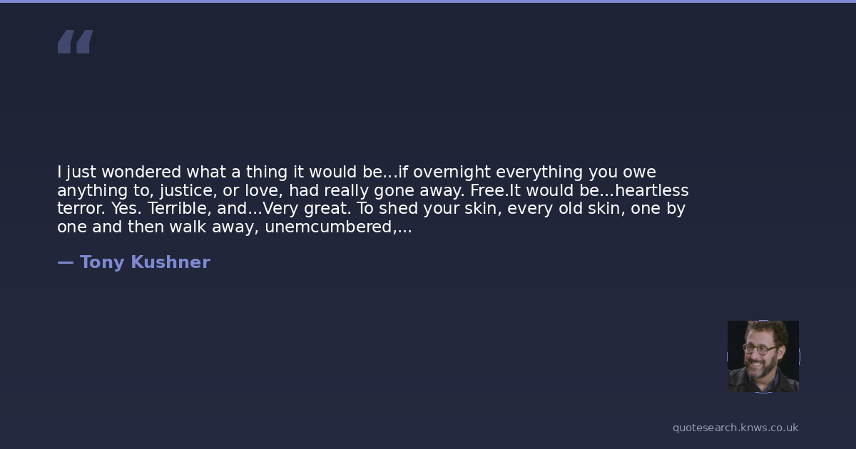 I just wondered what a thing it would be...if overnight everything you owe anything to, justice, or love, had really gone away. Free.It would be...heartless terror. Yes. Terrible, and...Very great. To shed your skin, every old skin, one by one and then walk away, unemcumbered, into the morning.