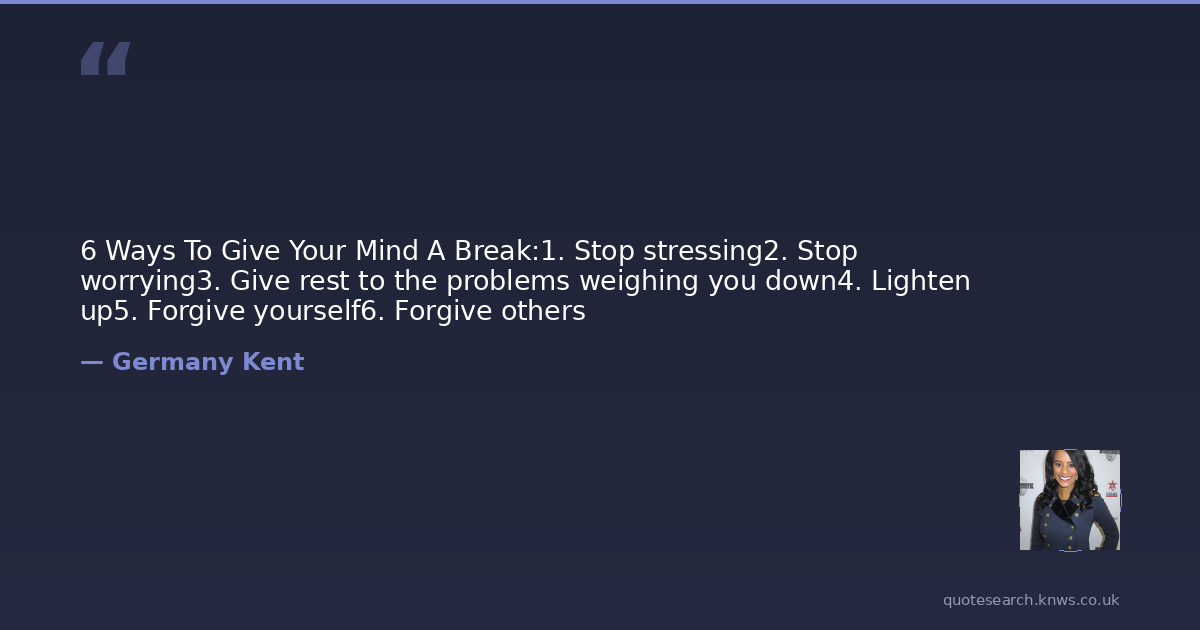6 Ways To Give Your Mind A Break:1. Stop stressing2. Stop worrying3. Give rest to the problems weighing you down4. Lighten up5. Forgive yourself6. Forgive others