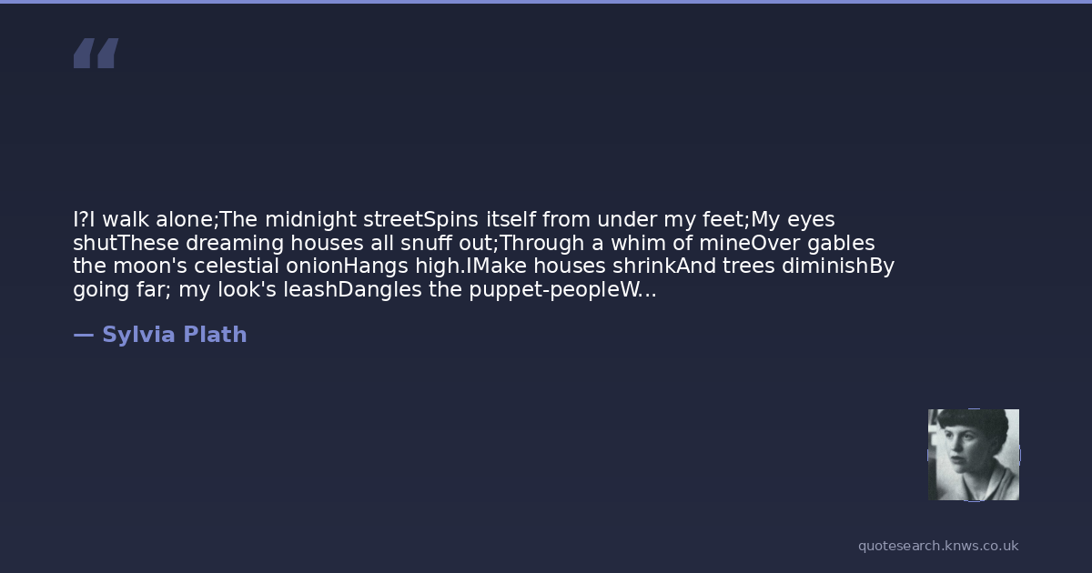 I?I walk alone;The midnight streetSpins itself from under my feet;My eyes shutThese dreaming houses all snuff out;Through a whim of mineOver gables the moon's celestial onionHangs high.IMake houses shrinkAnd trees diminishBy going far; my look's leashDangles the puppet-peopleWho, unaware how they dwindle,Laugh, kiss, get drunk,Nor guess that if I choose to blinkThey die.IWhen in good humour,Give grass its greenBlazon sky blue, and endow the sunWith gold;Yet, in my wintriest moods, I holdAbsolute powerTo boycott color and forbid any flowerTo be.IKnow you appearVivid at my side,Denying you sprang out of my head,Claiming you feelLove fiery enough to prove flesh real,Though it's quite clearAll your beauty, all your wit, is a gift, my dear,From me."Soliloquy of the Solipsist", 1956