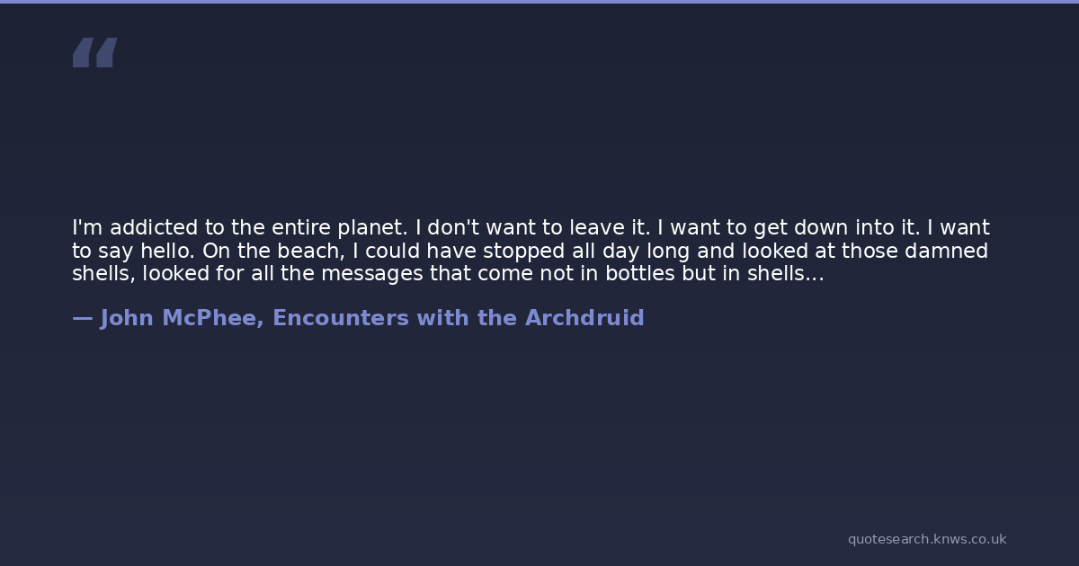 I'm addicted to the entire planet. I don't want to leave it. I want to get down into it. I want to say hello. On the beach, I could have stopped all day long and looked at those damned shells, looked for all the messages that come not in bottles but in shells...