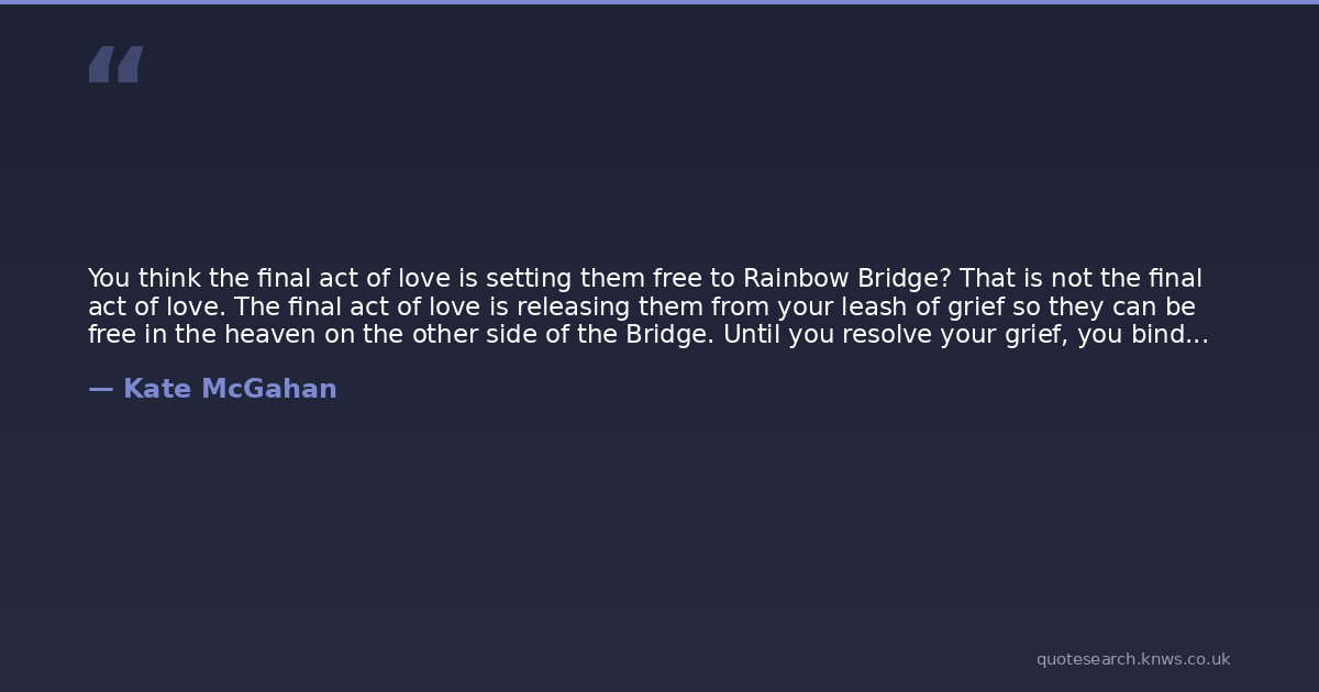 You think the final act of love is setting them free to Rainbow Bridge? That is not the final act of love. The final act of love is releasing them from your leash of grief so they can be free in the heaven on the other side of the Bridge. Until you resolve your grief, you bind them to you in the land between Heaven and Earth while they wait, suspended between the worlds, for you to heal. When you are free of your grief, they are free of your grief.