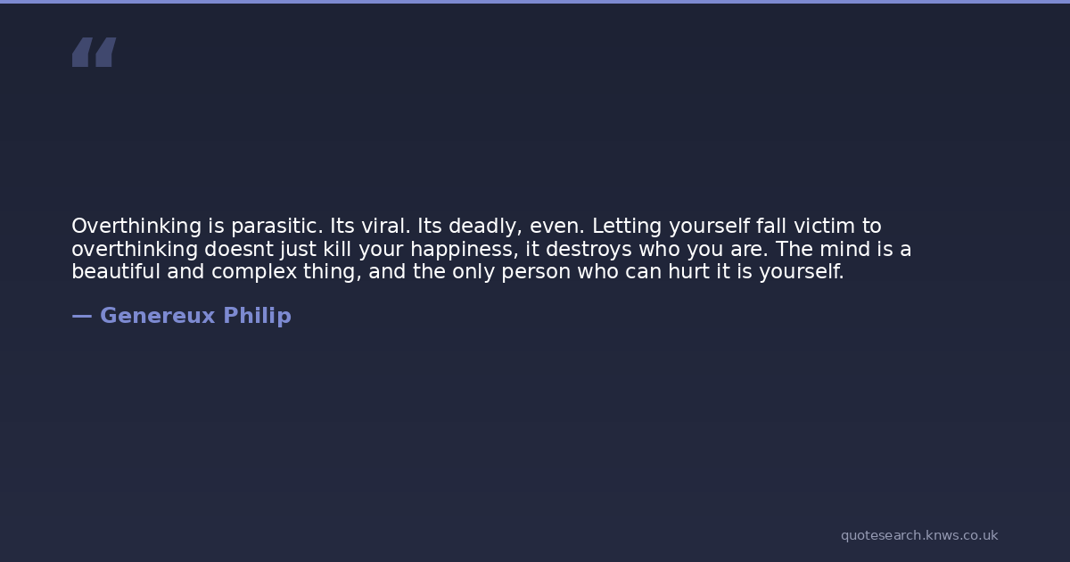 Overthinking is parasitic. Its viral. Its deadly, even. Letting yourself fall victim to overthinking doesnt just kill your happiness, it destroys who you are. The mind is a beautiful and complex thing, and the only person who can hurt it is yourself.
