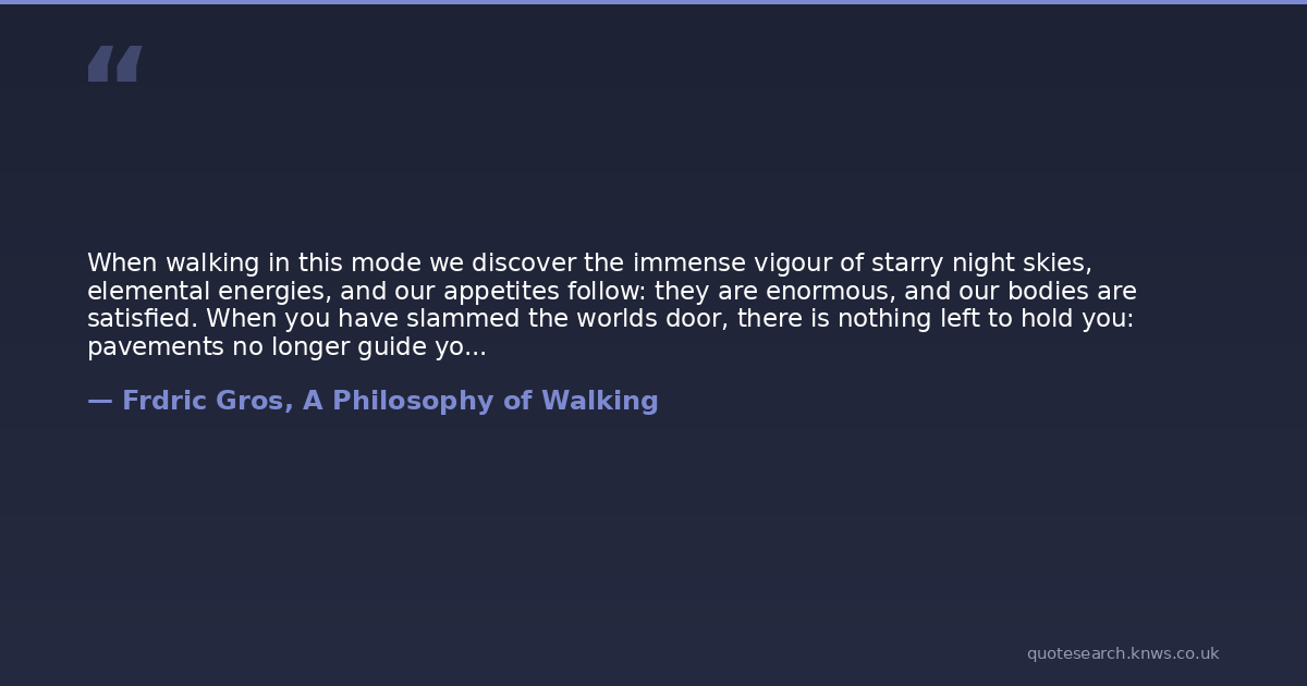 When walking in this mode we discover the immense vigour of starry night skies, elemental energies, and our appetites follow: they are enormous, and our bodies are satisfied. When you have slammed the worlds door, there is nothing left to hold you: pavements no longer guide your steps (the path, a hundred thousand times repeated, of the return to the fold). Crossroads shimmer like hesitant stars, you rediscover the tremulous fear of choosing, a vertiginous freedom.