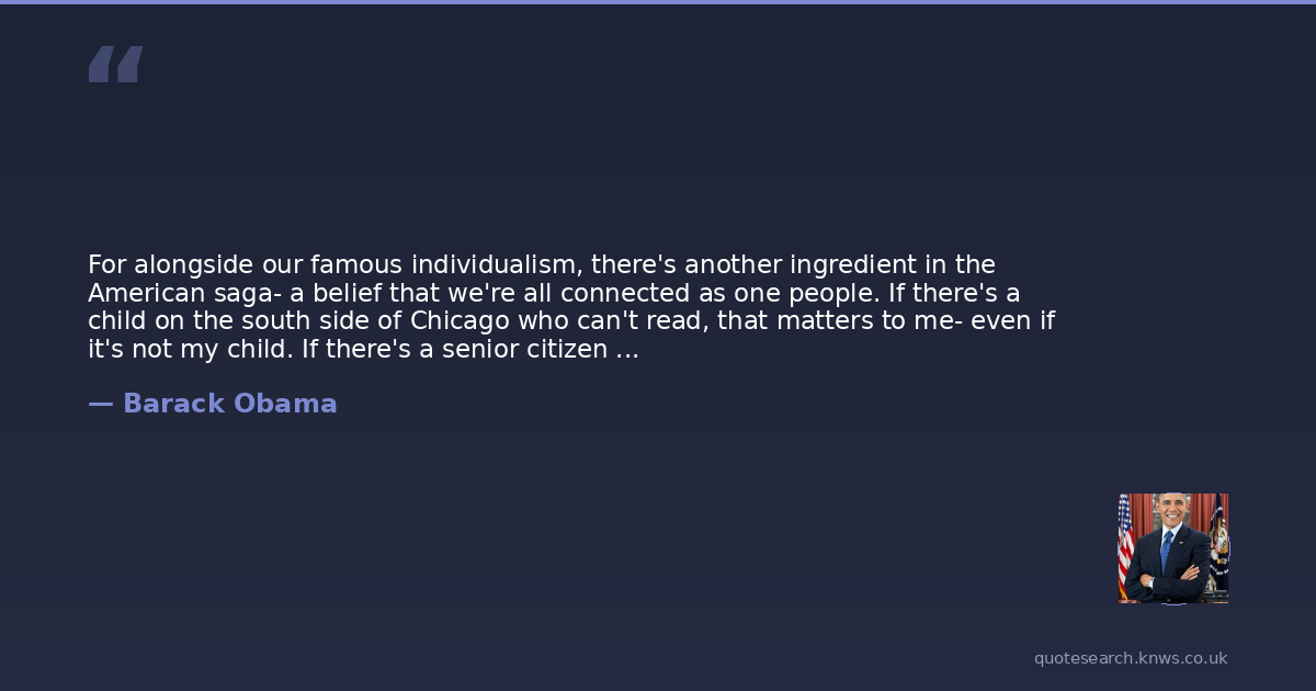For alongside our famous individualism, there's another ingredient in the American saga- a belief that we're all connected as one people. If there's a child on the south side of Chicago who can't read, that matters to me- even if it's not my child. If there's a senior citizen somewhere who can't pay for their prescription drugs and has to choose between medicine and the rent, that makes my life poorer- even if it's not my grandparent. If there's an Arab-American family being rounded up without benefit of an attorney or due process, that that threatens my civil liberties. It is that fundamental belief- I am my brothers keeper, I am my sisters keeper- that makes this country work.
