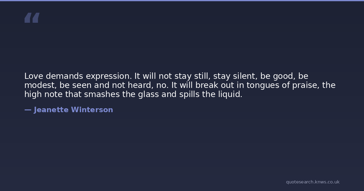 Love demands expression. It will not stay still, stay silent, be good, be modest, be seen and not heard, no. It will break out in tongues of praise, the high note that smashes the glass and spills the liquid.