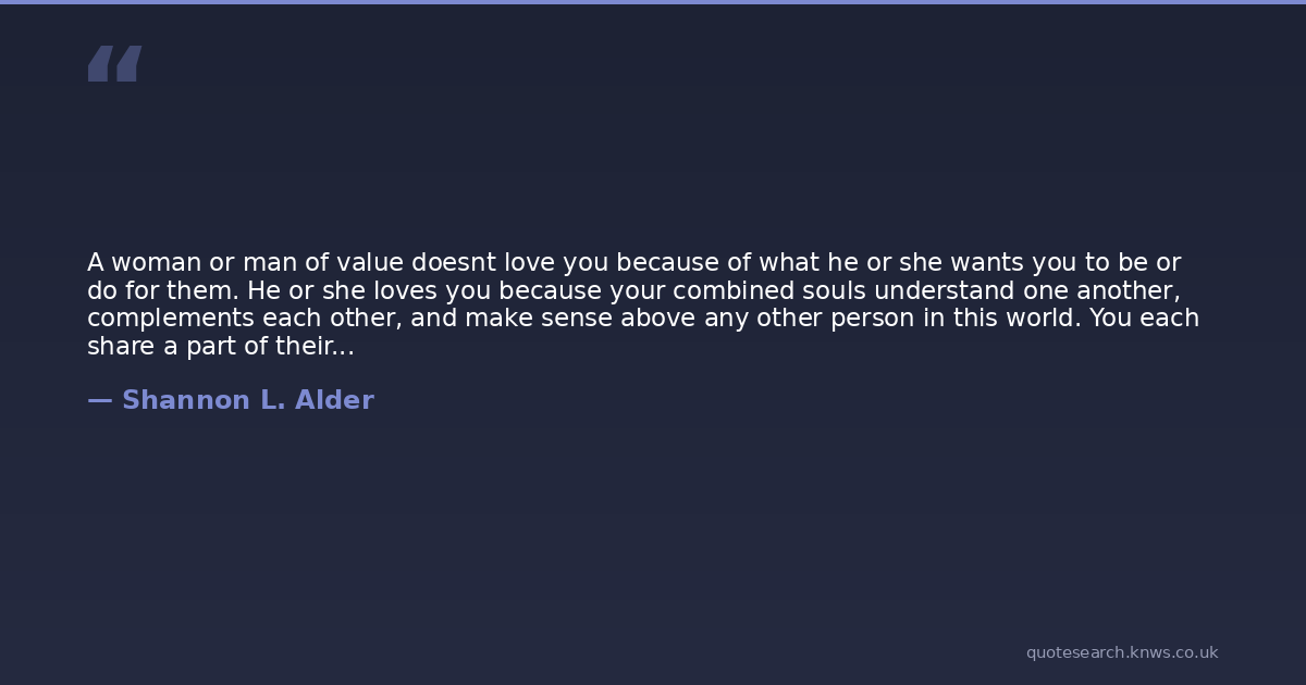 A woman or man of value doesnt love you because of what he or she wants you to be or do for them. He or she loves you because your combined souls understand one another, complements each other, and make sense above any other person in this world. You each share a part of their soul's mirror and see each others light reflected in it clearly. You can easily speak from the heart and feel safe doing so. Both of you have been traveling a parallel road your entire life. Without each other's presence, you feel like an old friend or family member was lost. It bothers you, not because you have given it too much meaning, but because God did. This is the type of person you don't have to fight for because you can't get rid of them and your heart doesn't want them to leave anyways.