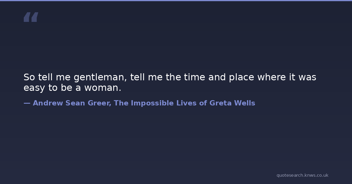 So tell me gentleman, tell me the time and place where it was easy to be a woman. chauvinism feminism misogyny womanhood Download Image Share on X Share on Facebook Copy Link