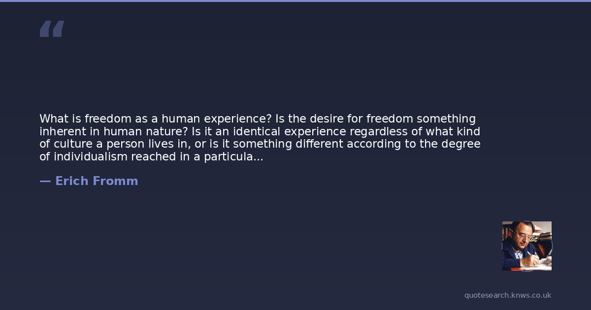 What is freedom as a human experience? Is the desire for freedom something inherent in human nature? Is it an identical experience regardless of what kind of culture a person lives in, or is it something different according to the degree of individualism reached in a particular society? Is freedom only the absence of external pressure or is it also the presence of somethingand if so, of what? What are the social and economic factors in society that make for the striving for freedom? Can freedom become a burden, too heavy for man to bear, something he tries to escape from? Why then is it that freedom is for many a cherished goal and for others a threat?