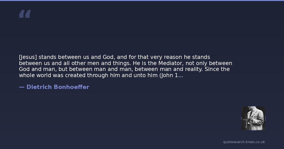 [Jesus] stands between us and God, and for that very reason he stands between us and all other men and things. He is the Mediator, not only between God and man, but between man and man, between man and reality. Since the whole world was created through him and unto him (John 1:3; 1st Cor. 8:6; Heb. 1:2), he is the sole Mediator in the world...The call of Jesus teaches us that our relation to the world has been built on an illusion. All the time we thought we had enjoyed a direct relation with men and things. This is what had hindered us from faith and obedience. Now we learn that in the most intimate relationships of life, in our kinship with father and mother, bothers and sisters, in married love, and in our duty to the community, direct relationships are impossible. Since the coming of Christ, his followers have no more immediate realities of their own, not in their family relationships nor in the ties with their nation nor in the relationships formed in the process of living. Between father and son, husband and wife, the individual and the nation, stands Christ the Mediator, whether they are able to recognize him or not. We cannot establish direct contact outside ourselves except through him, through his word, and through our following of him. To think otherwise is to deceive ourselves.But since we are bound to abhor any deception which hides the truth from our sight, we must of necessity repudiate any direct relationship with the things of this world--and that for the sake of Christ. Wherever a group, be it large or small, prevents us from standing alone before Christ, wherever such a group raises a claim of immediacy it must be hated for the sake of Christ. For every immediacy, whether we realize it or not, means hatred of Christ, and this is especially true where such relationships claim the sanctions of Christian principles.,,There is no way from one person to another. However loving and sympathetic we try to be, however sound our psychology, however frank and open our behavior, we cannot penetrate the incognito of the other man, for there are no direct relationships, not even between soul and soul. Christ stands between us, and we can only get into touch with our neighbors through him. That is why intercession is the most promising way to reach our neighbors, and corporate prayer, offered in the name of Christ, the purest form of fellowship.