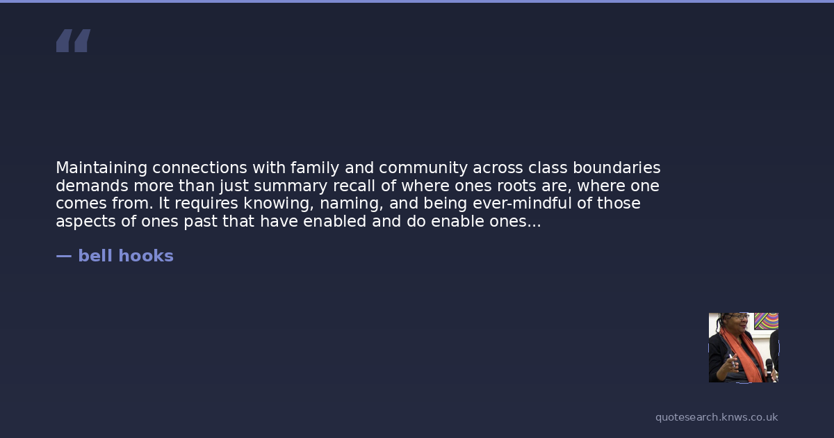 Maintaining connections with family and community across class boundaries demands more than just summary recall of where ones roots are, where one comes from. It requires knowing, naming, and being ever-mindful of those aspects of ones past that have enabled and do enable ones self-development in the present, that sustain and support, that enrich. One must also honestly confront barriers that do exist, aspects of that past that do diminish.