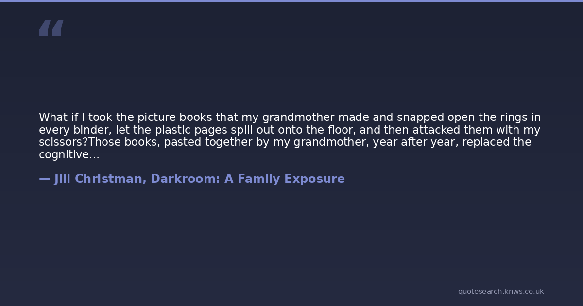 What if I took the picture books that my grandmother made and snapped open the rings in every binder, let the plastic pages spill out onto the floor, and then attacked them with my scissors?Those books, pasted together by my grandmother, year after year, replaced the cognitive exercise of memory for me. Sitting on a section of wall-to-wall carpeting, drinking the bubbling red birch beer from a tinted brown glass, I reestablished my relationships with the members of my family. This is where I put it all together and perpetuated the lies. Not malicious lies, but lies with so many years to develop that we forgot the truth because nobody rehearsed it. When Mark was sentence to sixty days in a twelve-step rehab program in 1991, he wrote an inventory of his experiences with drugs and alcohol that filled a whole notebook, and then he gave it to us to read, It was in those pages that I learned he had once tapped the powder out of horse tranquilizer capsules, melted it down, and shot it into his veins for a high that lasted fourteen days. My God, I thought, Oh my God. This is Mark's story? Okay, now put the cooked-down shot-up horse tranquilizer against the pictures in the album. What do you get? Collage. Dry made wet and introduced into the body. Cut cut cut. It's not so radical.