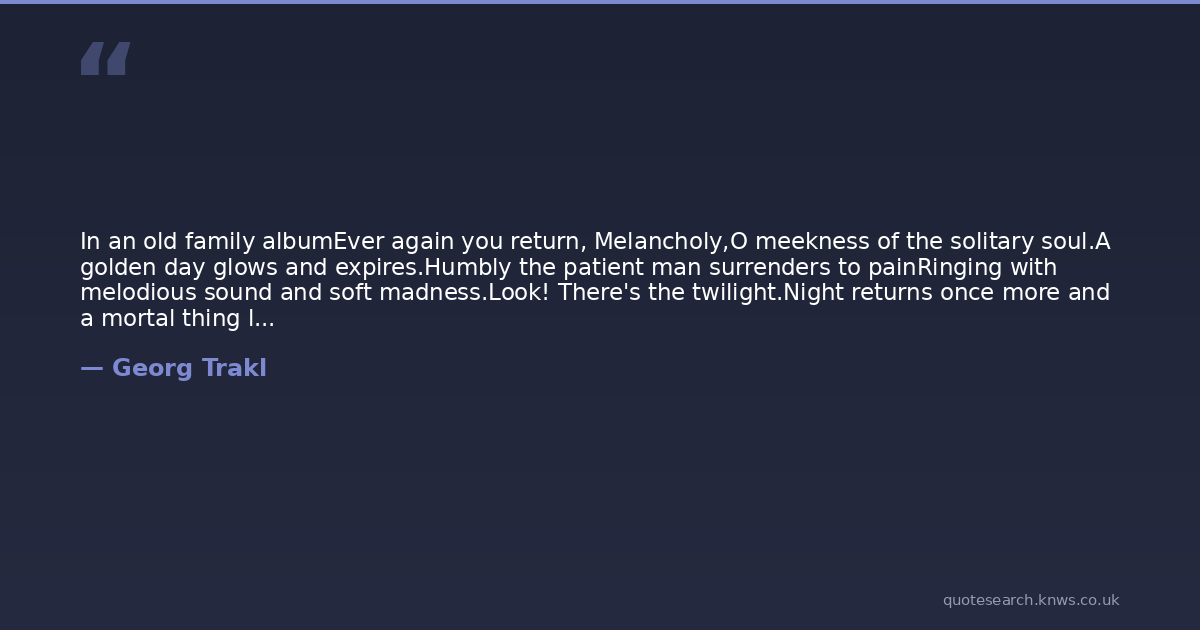 In an old family albumEver again you return, Melancholy,O meekness of the solitary soul.A golden day glows and expires.Humbly the patient man surrenders to painRinging with melodious sound and soft madness.Look! There's the twilight.Night returns once more and a mortal thing lamentsAnd another suffers in sympathy.Shuddering under autumn starsYearly the head is bowed deeper.-Georg Trakl (1887-1914)