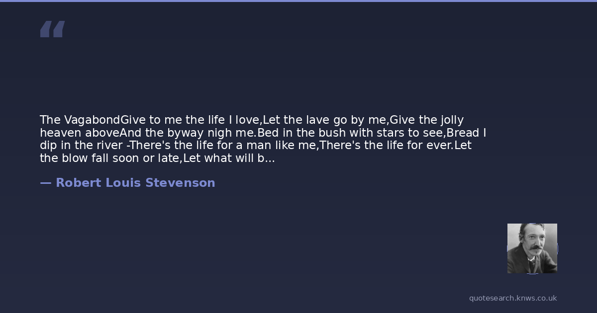 The VagabondGive to me the life I love,Let the lave go by me,Give the jolly heaven aboveAnd the byway nigh me.Bed in the bush with stars to see,Bread I dip in the river -There's the life for a man like me,There's the life for ever.Let the blow fall soon or late,Let what will be o'er me;Give the face of earth aroundAnd the road before me.Wealth I seek not, hope nor love,Nor a friend to know me;All I seek, the heaven aboveAnd the road below me.Or let autumn fall on meWhere afield I linger,Silencing the bird on tree,Biting the blue finger.White as meal the frosty field -Warm the fireside haven -Not to autumn will I yield,Not to winter even!Let the blow fall soon or late,Let what will be o'er me;Give the face of earth around,And the road before me.Wealth I ask not, hope nor love,Nor a friend to know me;All I ask, the heaven aboveAnd the road below me.