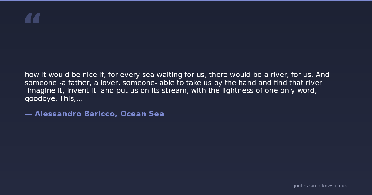how it would be nice if, for every sea waiting for us, there would be a river, for us. And someone -a father, a lover, someone- able to take us by the hand and find that river -imagine it, invent it- and put us on its stream, with the lightness of one only word, goodbye. This, really, would be wonderful. It would be sweet, life, every life. And things wouldnt hurt, but they would get near taken by stream, one could first shave and then touch them and only finally be touched. Be wounded, also. Die because of them. Doesnt matter. But everything would be, finally, human. It would be enough someones fancy -a father, a lover, someone- could invent a way, here in the middle of the silence, in this land which dont wanna talk. Clement way, and beautiful.A way from here to the sea.