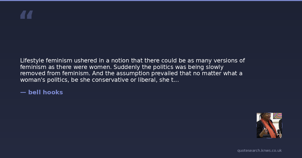 Lifestyle feminism ushered in a notion that there could be as many versions of feminism as there were women. Suddenly the politics was being slowly removed from feminism. And the assumption prevailed that no matter what a woman's politics, be she conservative or liberal, she too could fit feminism into her existing lifestyle.