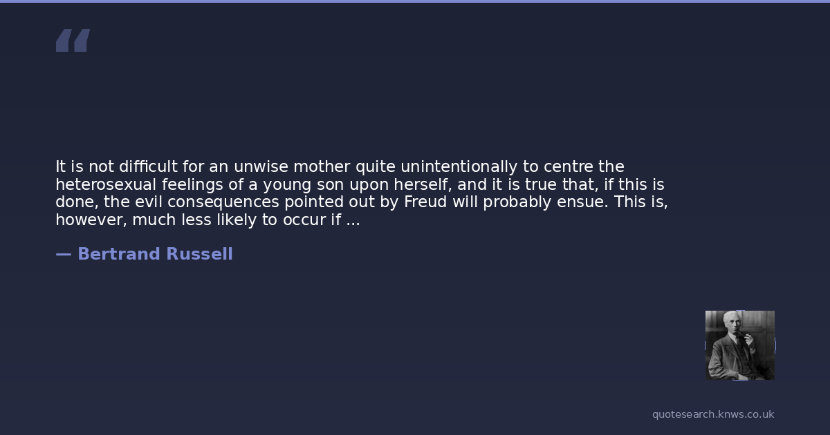 It is not difficult for an unwise mother quite unintentionally to centre the heterosexual feelings of a young son upon herself, and it is true that, if this is done, the evil consequences pointed out by Freud will probably ensue. This is, however, much less likely to occur if the mother's sexual life is satisfying to her, for in that case she will not look to her child for a type of emotional satisfaction which ought to be sought only from adults. The parental impulse in its purity is an impulse to care for the young, not to demand affection from them, and if a woman is happy in her sexual life she will abstain spontaneously from all improper demands for emotional response from her child.
