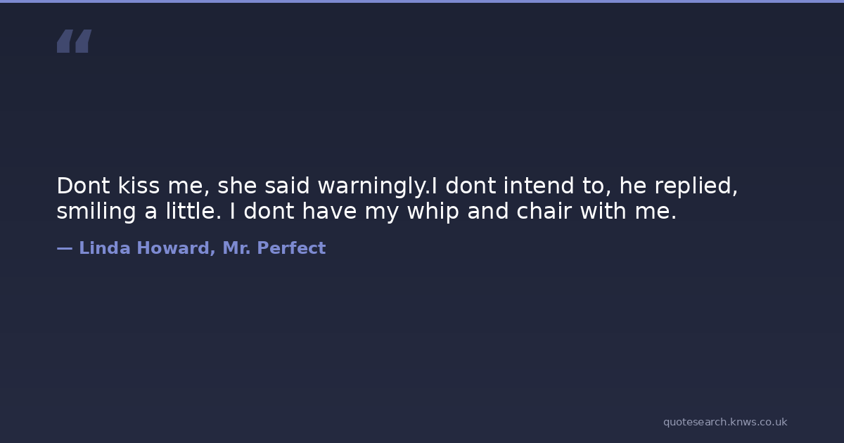 Dont kiss me, she said warningly.I dont intend to, he replied, smiling a little. I dont have my whip and chair with me.