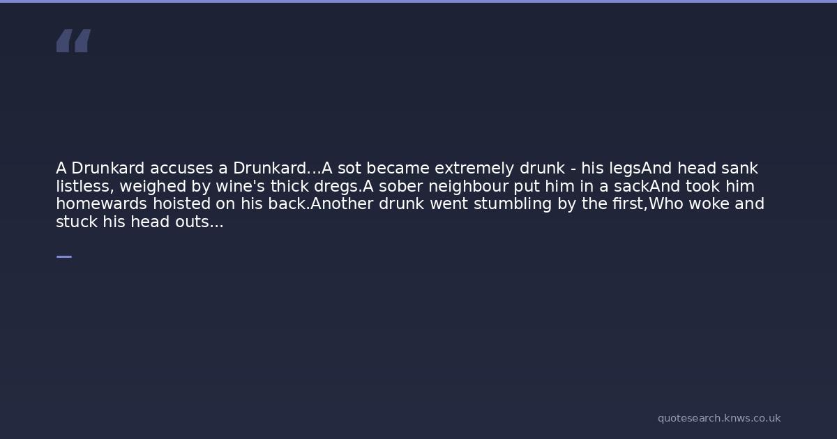 A Drunkard accuses a Drunkard...A sot became extremely drunk - his legsAnd head sank listless, weighed by wine's thick dregs.A sober neighbour put him in a sackAnd took him homewards hoisted on his back.Another drunk went stumbling by the first,Who woke and stuck his head outside and cursed."Hey, you, you lousy dipsomaniac,"He yelled as he was borne off in the sack,"If you'd had fewer drinks, just two or three,You would be walking now as well as me.