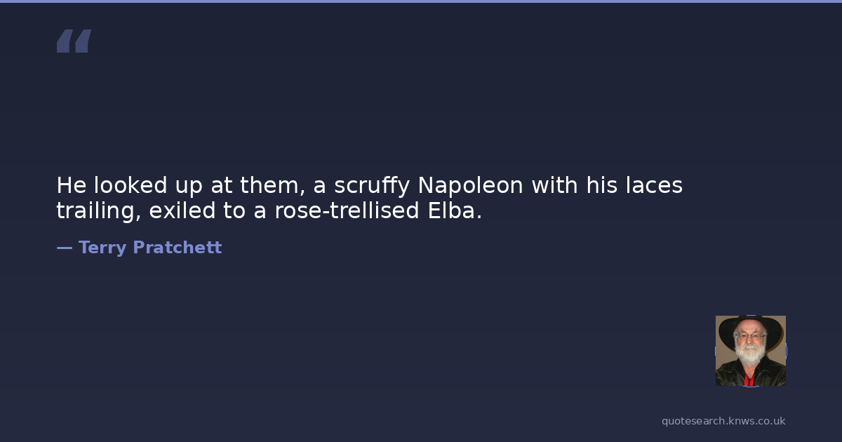 He looked up at them, a scruffy Napoleon with his laces trailing, exiled to a rose-trellised Elba.