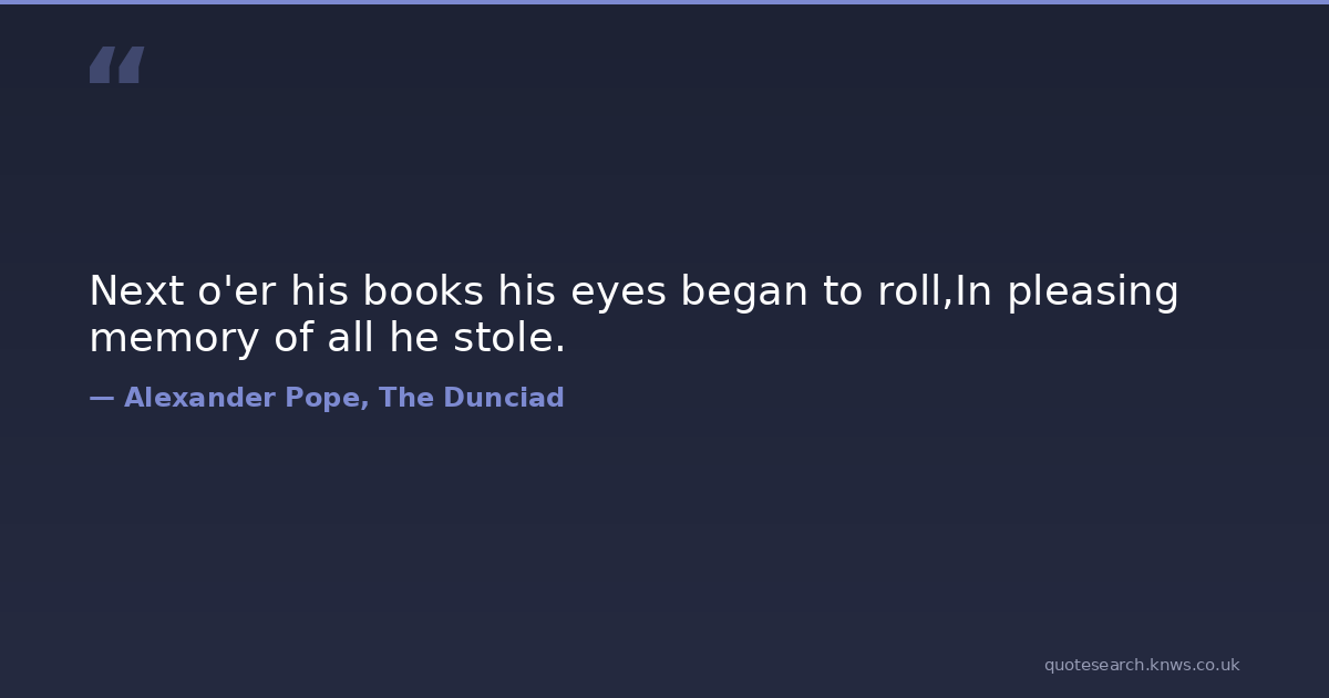 Next o'er his books his eyes began to roll,In pleasing memory of all he stole. books poetry Download Image Share on X Share on Facebook Copy Link