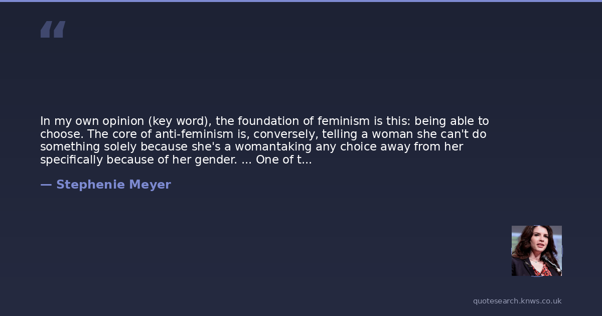 In my own opinion (key word), the foundation of feminism is this: being able to choose. The core of anti-feminism is, conversely, telling a woman she can't do something solely because she's a womantaking any choice away from her specifically because of her gender. ... One of the weird things about modern feminism is that some feminists seem to be putting their own limits on women's choices. That feels backward to me. It's as if you can't choose a family on your own terms and still be considered a strong woman. How is that empowering? Are there rules about if, when, and how we love or marry and if, when, and how we have kids? Are there jobs we can and can't have in order to be a "real" feminist? To me, those limitations seem anti-feminist in basic principle.