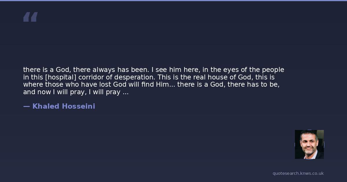 there is a God, there always has been. I see him here, in the eyes of the people in this [hospital] corridor of desperation. This is the real house of God, this is where those who have lost God will find Him... there is a God, there has to be, and now I will pray, I will pray that He will forgive that I have neglected Him all of these years, forgive that I have betrayed, lied, and sinned with impunity only to turn to Him now in my hour of need. I pray that He is as merciful, benevolent, and gracious as His book says He is.
