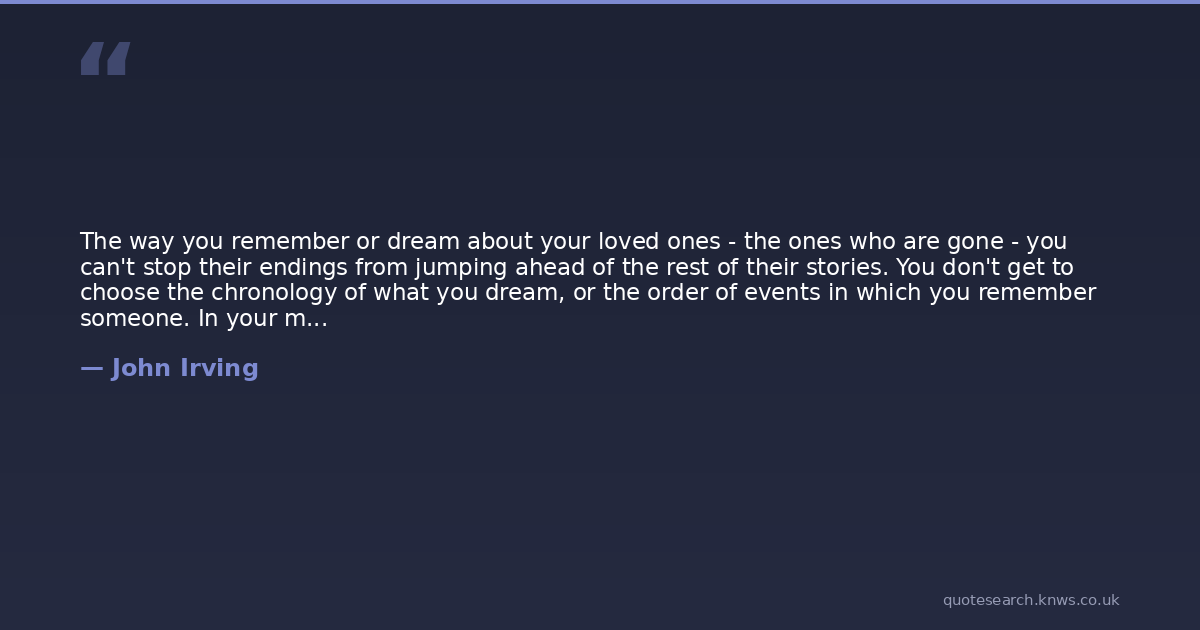 The way you remember or dream about your loved ones - the ones who are gone - you can't stop their endings from jumping ahead of the rest of their stories. You don't get to choose the chronology of what you dream, or the order of events in which you remember someone. In your mind - in your dreams, in your memories - sometimes the story begins with the epilogue.