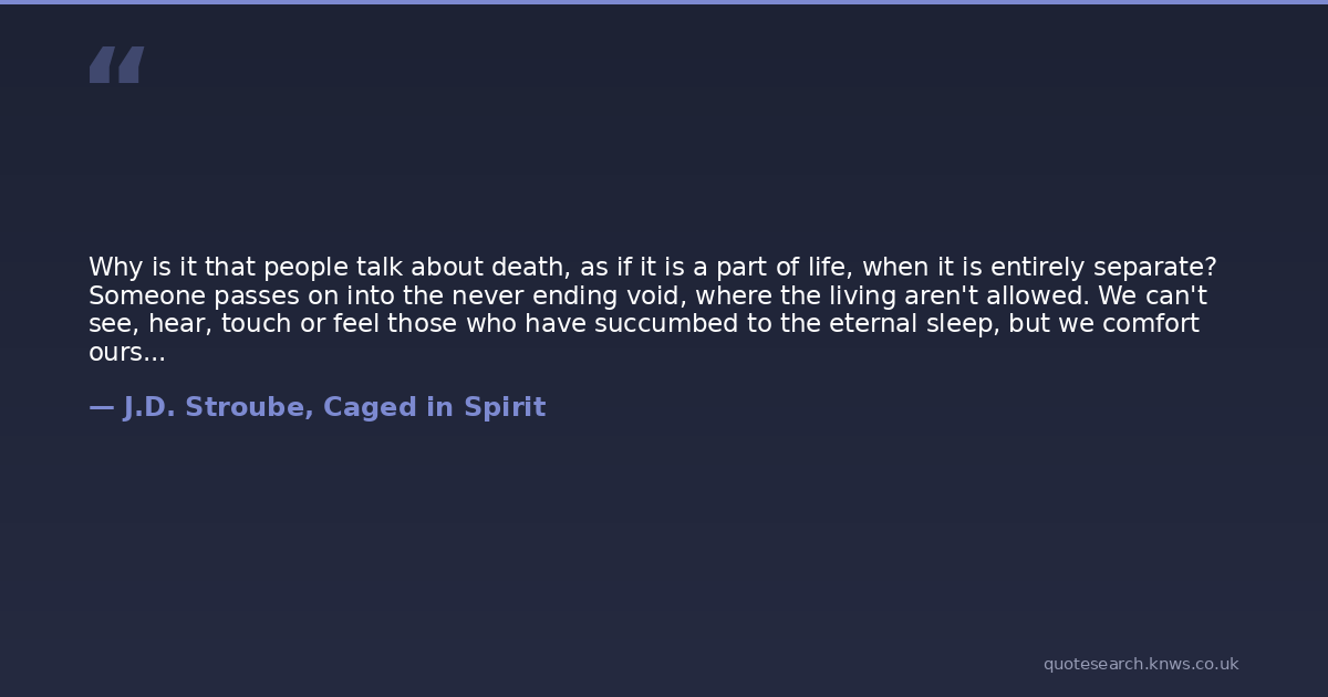 Why is it that people talk about death, as if it is a part of life, when it is entirely separate? Someone passes on into the never ending void, where the living aren't allowed. We can't see, hear, touch or feel those who have succumbed to the eternal sleep, but we comfort ourselves with thoughts of a grander plan. We tell ourselves that they are in a better place, but what could be greater than breathing the same air, as those loved ones? Their pain may be gone, but pleasure can only be when it is stark against the hurt that life brings?